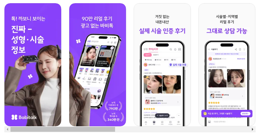 바비톡은 성형 및 피부 시술에 대한 정보, 가격 비교, 예약, 후기까지 한 번에 확인할 수 있는 앱입니다. 누적 다운로드 700만 건을 자랑하며, 성형 시술 후기 82만 건, 누적 게시글 300만 건의 방대한 데이터를 제공합니다. 이를 통해 성형 및 피부 시술에 대해 실질적인 정보를 얻고, 병원별 가격과 후기를 비교하여 신뢰성 있는 병원을 선택할 수 있습니다.